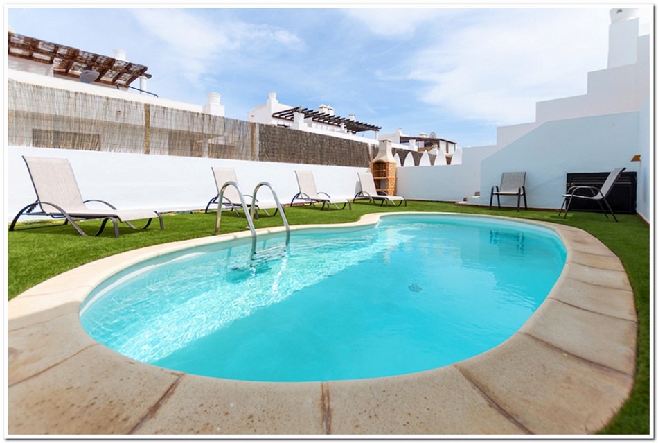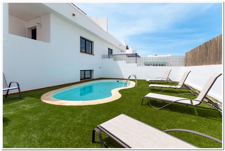 Accessible through internal staircase, the ground floor consists of an open plan lounge, dining area with a fitted kitchen, a bathroom, and a bedroom also with built-in wardrobes. Also handy on this level is access from the street and to a dining/sitting area from the kitchen, and further down to the private pool and sun lounging area.