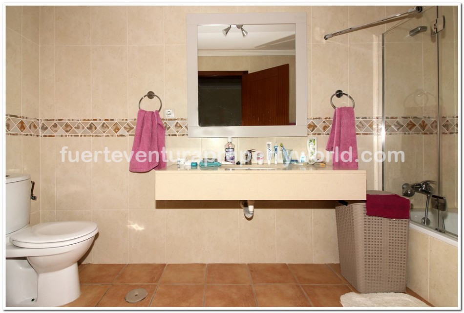 It has 3 double bedrooms with huge built-in wardrobes, 3 bathrooms (2 en-suite), an open plan lounge and dining area with a fully fitted kitchen that includes a 4-ring hob with extractor, oven, washing machine, etc., private sun terraces at the front and rear of the property, and a massive roof terrace with amazing open views towards the natural park, Lobos, and the pool.